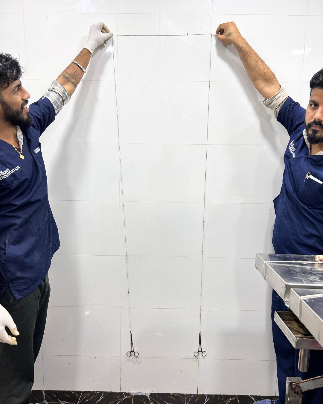 Surgically treated for foreign body removal (6+ feet of string) from intestines, now recovered and in the safe care of caretaker